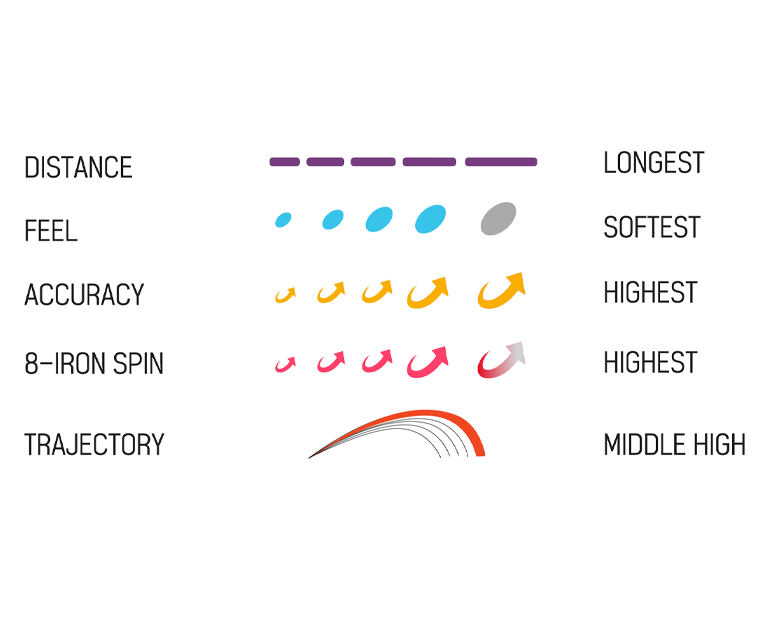 1. 采用高反弹材料制作的ND-BR球核,提供快速的球速,HPF内壳实现柔软的击球感和超长飞行距离。